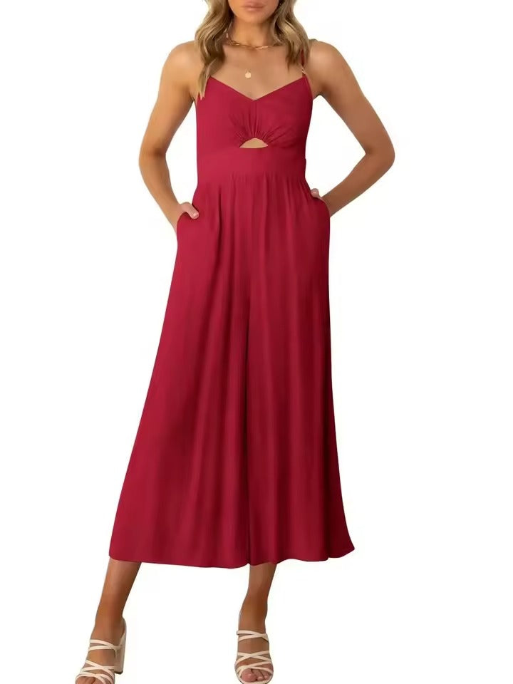 - Design: Scollatura a V, senza maniche, vita arricciata, gambe larghe
