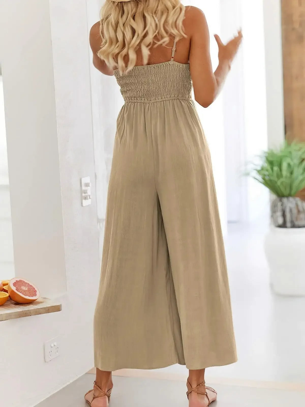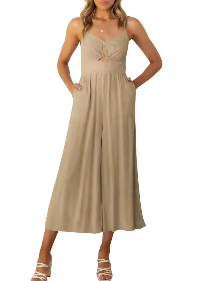 Say goodbye to stressful outfit choices and hello to tutta l'eleganza in un unico capo! Questo chic jumpsuit maxi dress valorizza ogni figura con la sua vita arricciata e il design ampio con gambe svasate. Che tu stia andando a fare brunch, per una giornata casual o a una festa estiva, questo vestito ti farà sentire sicura di te, alla moda e comoda grazie a tasche nascoste che tengono i tuoi essenziali a portata di mano senza sacrificare la moda.